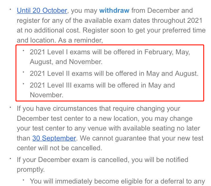 重点提醒:CFA可能取消考试,你可以重新预约2021年的考试,在10月20日前,可以申请取消、然后预约2021年考试。