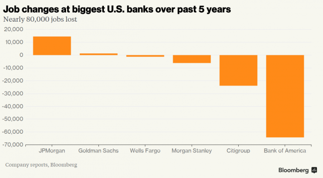过去五年,美国银行是裁员大军中的主力,裁员数量为六大银行之z。而摩根大通新增了z多的工作机会。