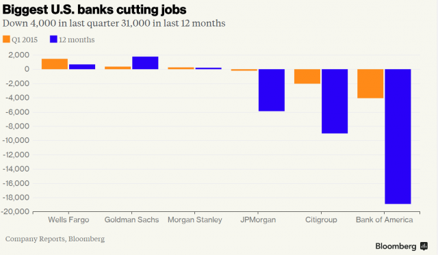 在过去的五年中,六大银行已经削减了接近8万个工作岗位。截至2015年3月31日,美国六大银行总雇员数为1,056,290名。